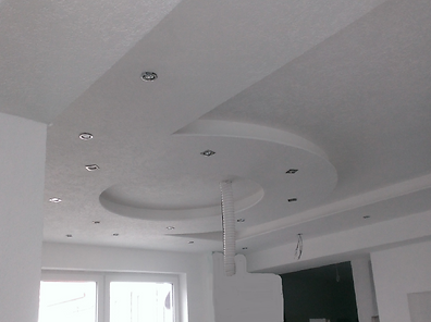 Decke abhängen in 2 Stufen, mit Kreisförmig freistehendem Kochfeld und seitlichem überstand für indirekte LED- Beleuchtung, aus Rigips hergestellt. inkl. LED-Einbauspots